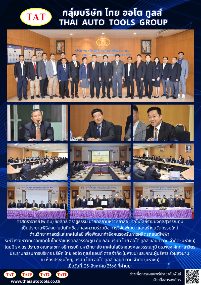 This cooperation signing ceremony was held at the main meeting room of Thai Auto Tools and Die Public Company Limited, Lat Lum Kaew District, Pathum Thani. The objective of this cooperation is to develop cooperation in the development of skills, as well as research and development that leads to new innovations in science. It will be coupled with strengthening management and integration capabilities to increase efficiency in the production of new graduates by creating manpower to support electric vehicle production. The cooperation meets the needs of the country's development and supports the growth of the EV manufacturing industry in the future.