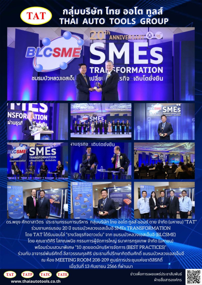 Dr. Payung Sakdasawit, Chairman of the Executive Committee, Thai Auto Tools and Die Public Company Limited or ZTAT, attended the “SMEs TRANSFORMATION” event held to celebrate the 20th Anniversary of Bangkok Bank’s Bualuang SME Club. He also received the "Outstanding Business Award" plaque from Mr. Chatsiri Sophonpanich, President of Bangkok Bank Public Company Limited. The award demonstrates TAT’s outstanding business performance and sustainable growth, and reflecting the company's success in running a business that designs and manufactures dies and tools for the automotive industry, and produces metal stamping auto parts with quality and international standards. Currently, the company is in the process of moving forward with its IPO plan to be listed on the Stock Exchange. Dr. Payung also participated in a special discussion on the topic: “The 10 BEST PRACTICES” sharing ideas on how to run a successful business. There were many people interested in listening to the discussion at the Queen Sirikit National Convention Center, Bangkok.